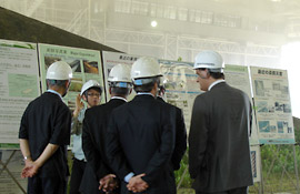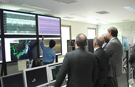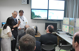 In the beginning, the introduction of NIED's organization and conducted research were presented by the President Dr. Okada. After that, Dr. Maesaka of the Storm, Flood and Landslide Research Unit introduced the Multi-Parameter Radar at its Data Analysis Room. Then, Dr. Pulido of the Earthquake and Volcano Research Unit introduced the Seismograph Networks of NIED at the Earthquake and Volcano Data Center. Finally, at the Large-scale Rainfall Simulator, the Minister Mr. Coelho and the delegates were not only introduced the facility by Dr. Ishizawa of the Storm, Flood and Landslide Research Unit, but also experienced the actual heavy rainfall of 200ml per hour.