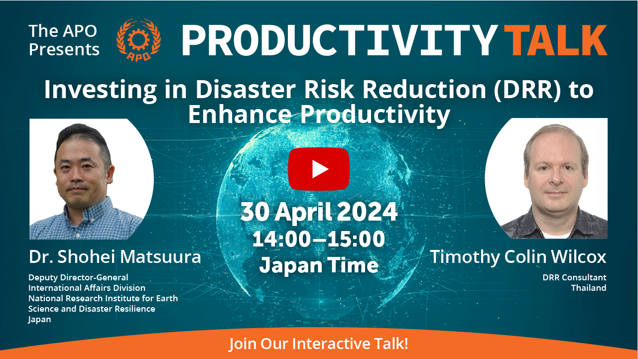 The topic, “Investing in Disaster Risk Reduction (DRR) to Enhance Productivity,” highlights the link between DRR and sustainable productivity and the need for resilience against economic and livelihood disruptions. Together with DRR consultant Mr. Timothy Wilcox, he will discuss the importance of investing in DRR and the effectiveness of cross-sectoral partnerships in building economic and community resilience. Good DRR practices from the Asia-Pacific region demonstrate how strategic efforts and long-term investments boost sustainable productivity growth.