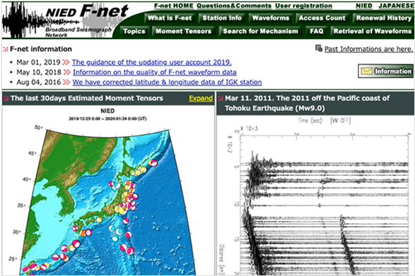 F-net is an observation network composed of high-sensitivity seismographs deployed at approximately 70 locations nationwide. F-net is capable of accurately detecting slow ground motions originating from remote seismic sources.