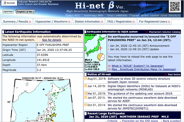 Hi-net is an observation network composed of high-sensitivity seismographs deployed at approximately 800 locations nationwide. The sensor is installed at the base of the borehole deeper than 100m. Hi-net is capable of detecting seismic motions that are too weak to be felt by people.