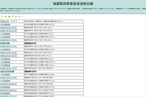 Annual report and news of earthquakes, for seismic intensities over 5 are available.