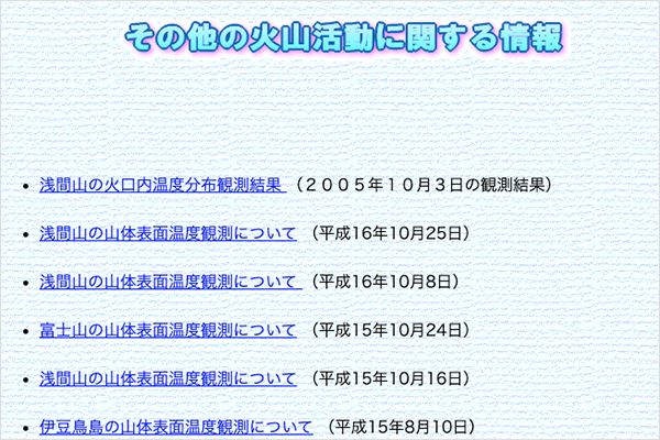 Temporal change of surface temperature distribution at volcanoes such as Mt. Asama, Mt. Fuji and Mt. Iwate using particular systems is open to the public.