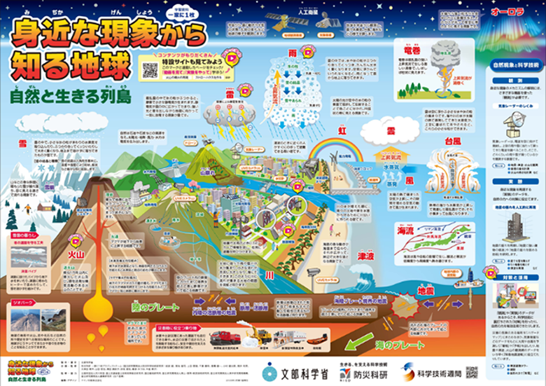 文部科学省が科学技術週間にあわせて毎年制作する学習資料「一家に1枚」について、令和8年度版のテーマとして、国立研究開発法人防災科学技術研究所(以下「防災科研」という。)が企画した「身近な現象から知る地球 自然と生きる列島(略称:地球)」が採択され、2026年3月24日、特設Webサイトにおいてデザインが公開されました。