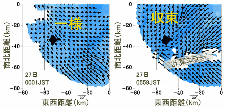 図2 国土交通省XRAINレーダーによる上空の風(矢印)と降水強度(青濃淡)。