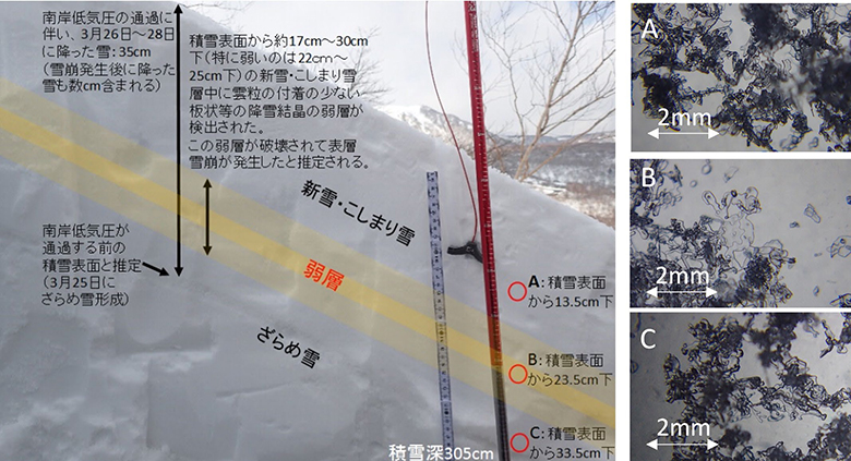 図3 現地調査(那須町雪崩災害第1回調査)により確認された弱層(黄色、雪結晶写真B)とその上に20cm以上ある積雪(雪結晶写真A)。