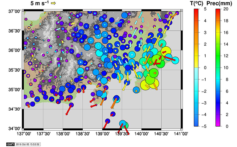 図4 大雪のさなか、2014年2月15日2時の1時間降水量(丸の大きさと色)と気温(矢印の色)と風向風速(矢印の向きと長さ)