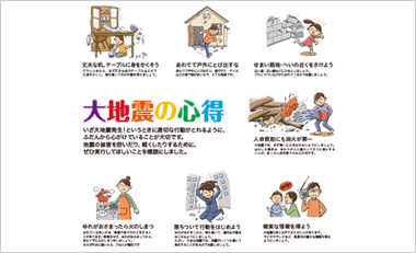いざ大地震発生!という場合、一人一人が適切な処置をとれるように、ふだんから心がけていることが大切です。地震の被害を防いだり、軽くしたりするために、日頃から気をつけ、ぜひ実行して欲しいことを標語にしました。