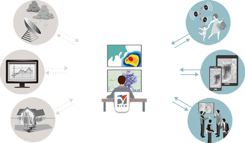 防災科研は、ユーザーの意思決定に役立つ「情報プロダクツ」の研究開発、および社会への実装に向けた取り組みを行っています。