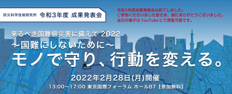 防災科研 令和3年度 成果発表会では、災害を国難にしないための「予防」に焦点をあて、「来るべき国難級災害に備えて2022 ~国難にしないために~ モノで守り、行動を変える。」をテーマとして、2022年2月28日(月)に、昨年度に引き続き池上彰氏を特別ゲストコメンテーターにお迎えし、会場参加とオンライン配信のハイブリッドで開催いたしました。