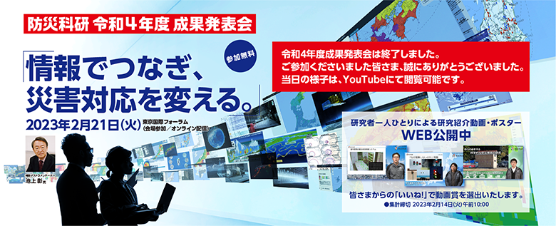 - ■ここに発表されている研究紹介動画、研究成果ポスターの著作権は国立研究開発法人防災科学技術研究所に帰属いたします。これらの一部または全部の複製は、私的利用、その他著作権法によって認められる範囲に限ります。なお、複製した著作物の転載、改変、送信、再配布等を行うことは固くお断りいたします。私的利用、その他著作権法によって認められる範囲を超えて使用しようとする方は、必ず、 doga_poster_goiken[AT]bosai.go.jp までお問い合わせの上、防災科研の許可を得てください。