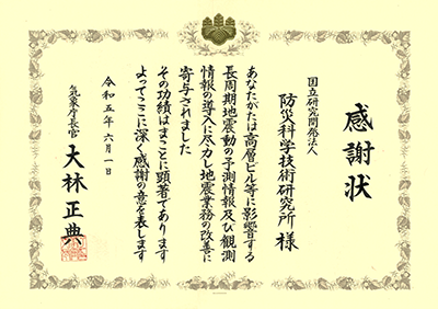 気象庁長官より感謝状をいただきました