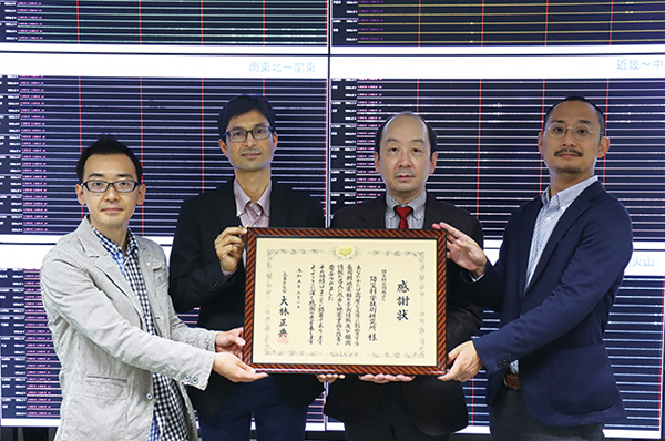 感謝状を持つ地震津波火山ネットワークセンターのメンバー