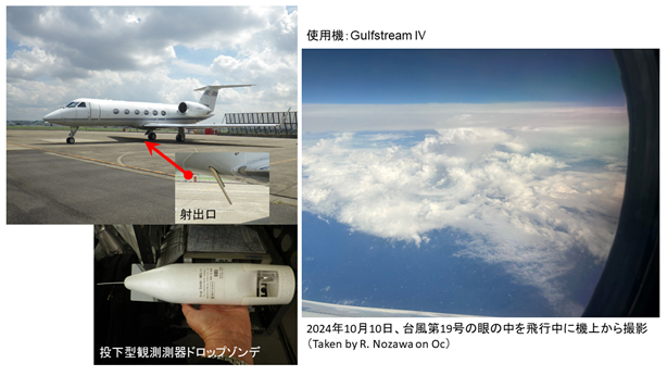 右:最新版のドロップゾンデを用いて2024年10月9-10日に実施した航空機観測中の台風第19号の眼の中の風景。