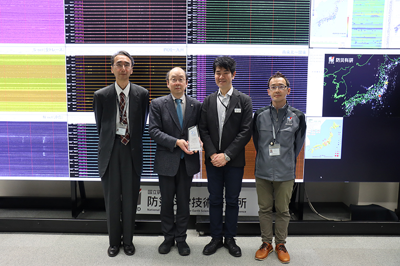 写真左から、巨大地変災害研究領域 地震津波火山観測研究センター 橋本徹夫調査役、青井真研究領域長、西日本旅客鉄道株式会社 山陽新幹線統括本部 東京新幹線総合指令所 千代誠副所長、地震津波火山観測研究センター 陸域強震観測グループ 鈴木亘グループ長