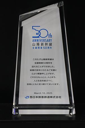 西日本旅客鉄道株式会社は、3月10日に山陽新幹線全線開業50年を迎え、多年にわたる支援に感謝の意と今後のさらなる成長に向けた決意を伝える目的で関係事業者に50周年を記念した盾を謹呈しています。