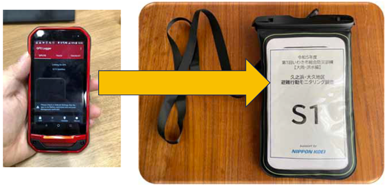写真1. 登山者に配布するGPSロガー(GPSアプリをインストールしたスマートフォン)とそれを入れるケース(約15cm×20cm)。