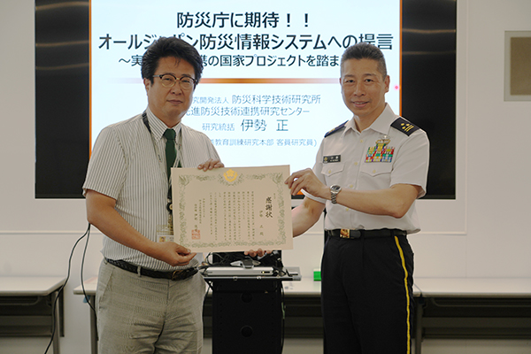 感謝状を持つ伊勢正研究統括と陸上自衛隊情報学校 第1教育部長 小澤学1等陸佐