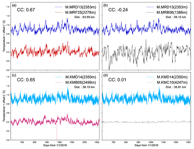 図:距離が近い観測点での海底温度時系列の比較。(a,b)距離50-60km程度の観測点のペアを比較している。(a)はほぼ同じ深さ、(b)は異なる深さ。(c,d)距離40km程度の観測点のペアを比較している。(c)はほぼ同じ深さ、(d)は異なる深さ。