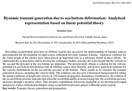 従来の津波の伝搬のみを扱う場合の流れの速度、海面での波高の時空間分布の数式とも比較することで、今回新たに導出した津波発生の項の持つ意味についても考察し、この項には海底面での地殻変動を海面での波高に焼き直す深さフィルターが含まれていること、大きな震源域の場合、海水中で鉛直方向の流れがより起こり易くなることなどを示した。