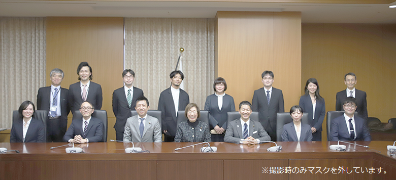 永岡文部科学大臣(前列中央)、井出文部科学副大臣(前列中央左)、山本文部科学大臣政務官(前列中央右)
