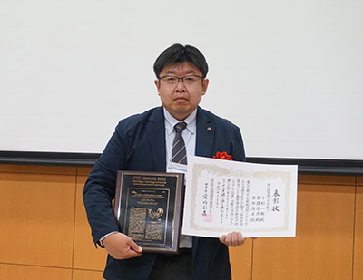 表彰状と表彰楯を持つ中村一樹センター長