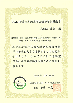 2022年度日本地震学会若手学術奨励賞を受賞しました