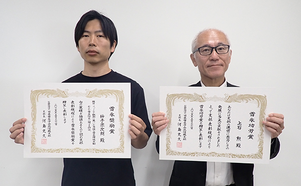 賞状を持つ砂子宗次朗特別研究員(左)と上石勲特別研究員(右)