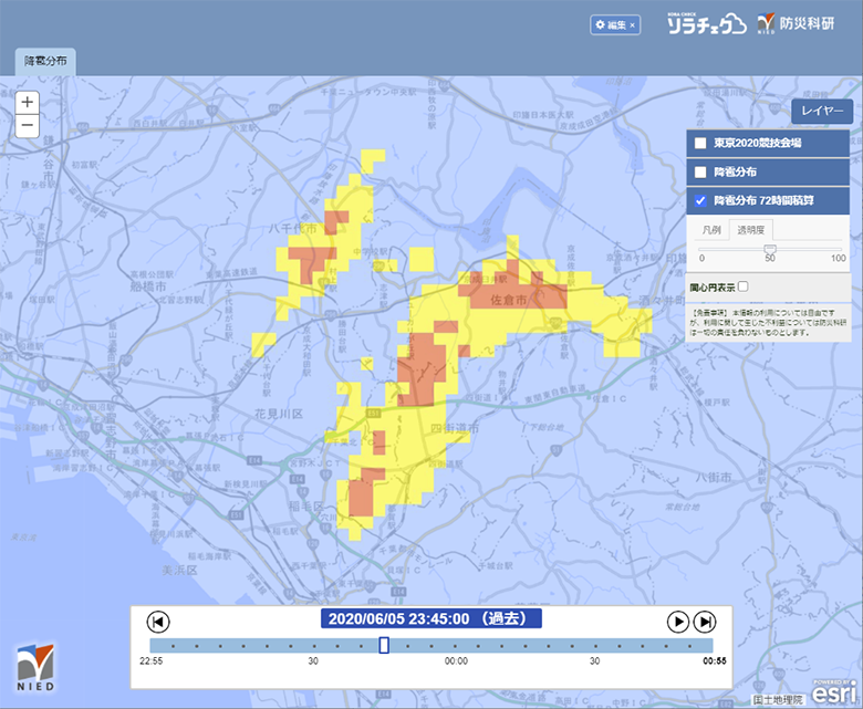 図1 降雨分布の表示例(年月日・時刻はダミーで実際とは異なります)
