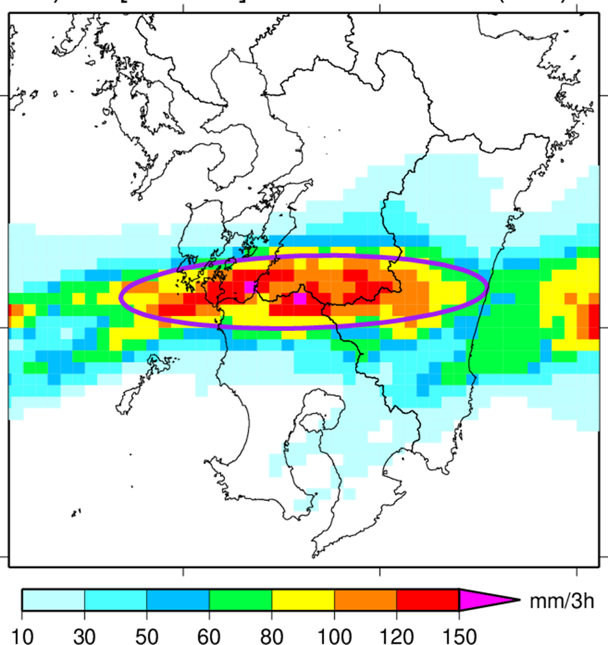 図1 2020年7月4日2時(日本時)における3時間積算雨量と自動検出結果(紫色の楕円)。日本気象協会は、この手法を用いたリアルタイム監視システムを構築し、2019年から九州地域の自治体との実証実験を開始してきており、令和2年7月豪雨において、九州で図1を含む13個の線状降水帯を検出しました(日本気象協会防災レポート https://www.jwa.or.jp/news/2020/07/10461/)。