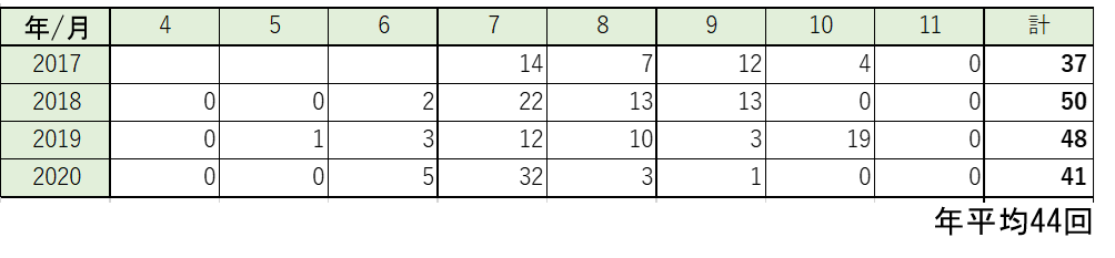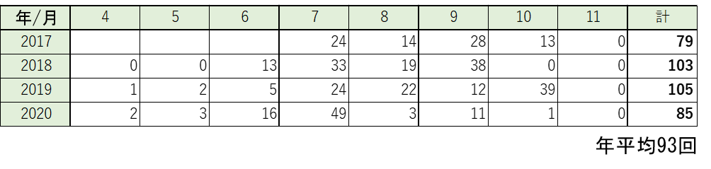 より厳しい検出条件を設定(①の条件を80 mmから100 mmに、③の条件を100 mmから150 mmに変更し、抽出後3時間は時空間的な連続性が高い場合同一のものとみなす)した上で、全国を対象として2017年から2020年の月別の検出数を表1にまとめました。4年間の年平均で93回の検出となりますが、その全ての事例で大雨による著しい災害が発生したわけではありません。