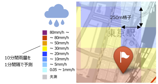 気象レーダ「MP-PAWR」の観測データを基に、1分ごとに10分先、20分先、30分先の降雨を予測し、250m間隔でメッシュ化し配信