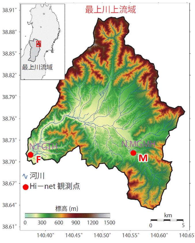 図1a 本研究で使用したHi-net観測点の位置最上川上流域に、Hi-net観測点が2点(F地点とM地点)設置されています。