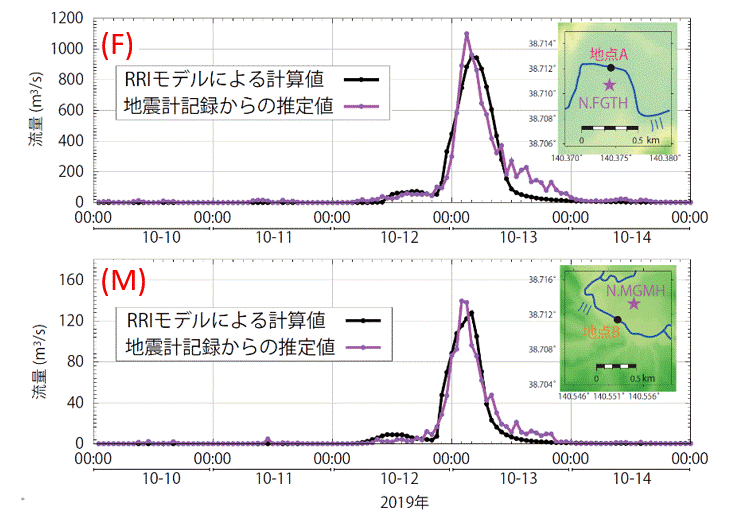 (P.C. and Sawazaki (2021, PEPS)を改変)2019年10月の洪水(令和元年東日本台風によるもの)において、FとMで記録された雑微動強度から推定した流量(紫)と、RRIモデルを使って計算した流量(黒)との比較です。流量は挿入図の黒丸で示した地点(AとB)で計算したもの。流量を計算した地点とHi-net観測点とは200mから300mほど離れていますが、雑微動記録から推定した流量が計算流量と非常によく一致することが分かります。