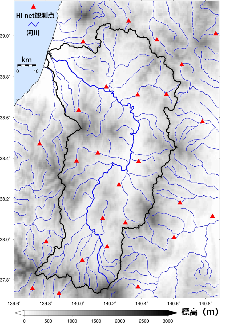 図2a 最上川近傍のHi-net観測点最上川上流域における河川の近傍にも多くのHi-net観測点が設置されていることが分かります。青色の太線で示したのが最上川の本流です。