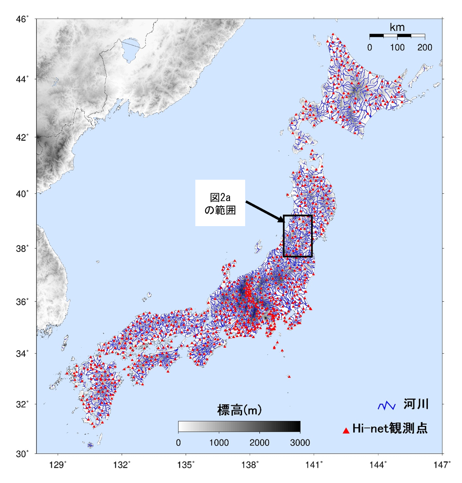 図2b 全国のHi-net観測点と河川Hi-net観測点(赤三角)は約20km間隔で全国に展開されており、河川の近傍に多くのHi-net観測点が設置されていることが分かります。図中に示した河川(青線)は国土交通省が提供する国土数値情報河川データに基づくもので、国土保全上または経済上、特に重要な一級・二級河川のほとんどと、その他の重要な河川が含まれています。