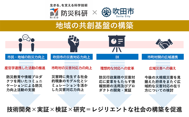本協定にもとづき、防災科研と吹田市はレジリエントな社会の構築を目指した技術開発および実証研究を促進する目的として、以下の連携協力を行っていきます。