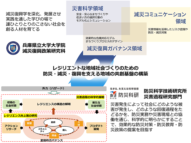 兵庫県立大学大学院減災復興政策研究科では、阪神・淡路大震災等の教訓を踏まえ、兵庫県内市町村をはじめとして現場に根ざして、災害に強い社会づくりのための次の3領域からなる教育研究を推進している。