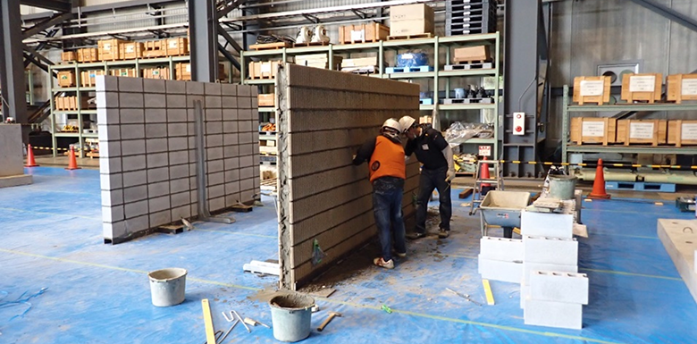 コンクリートブロック造による塀(ブロック塀)の耐震性、安全性を評価するため、E-ディフェンスを用いた実大震動台実験を行います。