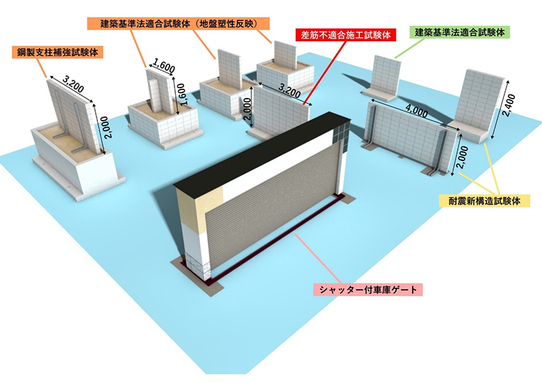 現在、ブロック塀の施工においては、建築基準法を基に行われていますが、古くからのブロック塀も存在しており、それらの安全性、限界性能の評価および様々な知見は国民の関心事項となっています。そこで、本実験では、建築基準法適合、建築基準法不適合、建築基準法不適合に耐震補強を施したもの、新たな構造を採用したものなど全8種類のブロック塀を試験体として製作し、実際の地震動をベースとした加振実験で検証します。 - 2.実験概要