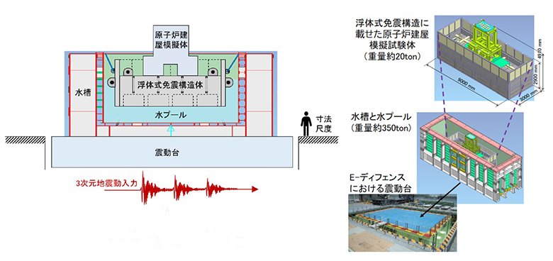 このような利点を有する浮体式免震技術について、原子力機構はこれまで、経済産業省の補助事業「革新的原子力技術のための共通基盤技術開発事業」の中で、民間企業とともに開発を進め、米国原子力規制委員会(USNRC)による原子力規制の視点での技術レビューを受ける活動を行っています。しかしこれまで大規模の浮体式免震構造の試験データは無く、並行して開発が進められている浮体式免震構造を適用したプラントの地震時安全性解析・評価手法の検証も不十分な状態です。そのため、原子力機構と防災科研は共同研究「原子力発電プラントに適用する浮体式免震建屋の振動時安定性に関する研究」の中で、大規模な試験体を用いて浮体式免震装置の実証試験を実施することとしました。今回の実証試験では、防災科研が運用する世界最大級震動台「実大三次元震動破壊実験施設(E-ディフェンス)」による約15分の1スケールで模擬した試験体の加振試験を実施し、浮体式免震構造による地震動低減効果に関する実証および地震時安全性設計用データを取得します。