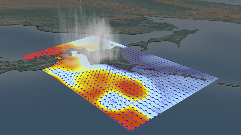 【参考図】2025年2月上旬の帯広におけるドカ雪の領域気象モデル※4による数値シミュレーションの結果の可視化。白~灰色の領域は雪雲の3次元分布、陰影は海面水温、矢印は地上付近の水平風を示す。可視化にはMet.3D (https://met3d.wavestoweather.de/met-3d.html)を使用した。