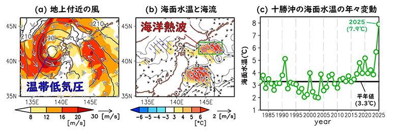 図2.(a)2025年2月4日0から3時の期間で平均した10m高度の水平風(矢印)、その大きさ(風速; 陰影)およびジオポテンシャル高度(等値線)の水平分布図。(b)2024年2月4日における海面における水温(等値線)、その平年値からのずれ(陰影)および海流(矢印)の水平分布図。強い海洋熱波が発生していた海域を斜線で示す。(c)図2bの緑枠内で領域平均した2月上旬の海面水温の1982~2025年の時系列図。黒線は平年値(1991~2020年の平均)を示す。