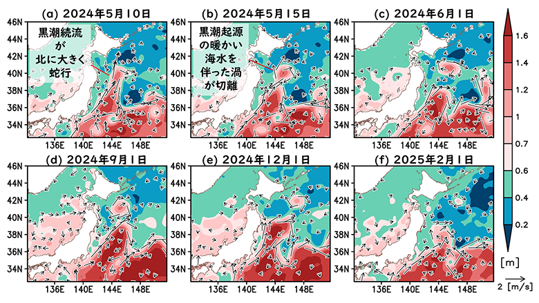 図3. 2024年5月から2025年2月の期間における海面高度(陰影)と海流(矢印)の水平分布図。