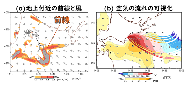 図4.(a)2025年2月4日0から3時の期間で平均した985hPaにおける相当温位の水平勾配の大きさ(陰影)と水平風(矢印)の水平分布図。数値が大きなところに前線が存在することを意味する。(b)2025年2月4日0時に十勝平野沿岸域に存在した空気の流入経路の可視化。線が空気の流入経路、線の色が空気の相当温位を示す。線の色が寒色系から暖色系に変化する(つまり、相当温位が増加する)ことは、空気が温暖・湿潤化したことを意味する。黄色の陰影は2025年2月4日の海面水温の平年値からのずれ、矢印は2025年2月3日12時~2月4日0時の期間で平均した985hPaにおける水平風を示す。