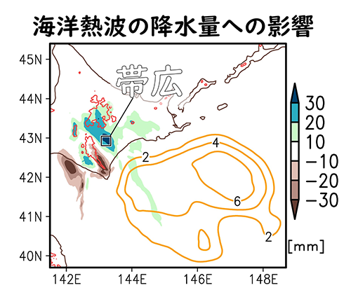 図5. 数値シミュレーションによって見積もられた海洋熱波が降水量へ与えた影響(陰影)。正の値が大きいほど、海洋熱波が降水量を増加させたことを意味する。黄色の等値線は再現シミュレーションと海洋熱波の影響を除去したシミュレーションとの間の海面水温の差(単位は℃)、赤色の等値線は標高800 mのラインを示す。