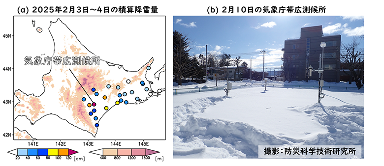図1.(a)北海道南東部の気象庁の地上観測点における2025年2月3日から4日の積算積雪量(cm)。陰影は標高(m)を示す。(b)2025年2月10日の気象庁帯広測候所の地上観測システムの様子(撮影:防災科学技術研究所)。2月4日にはこの写真の2倍程度の積雪が観測された。