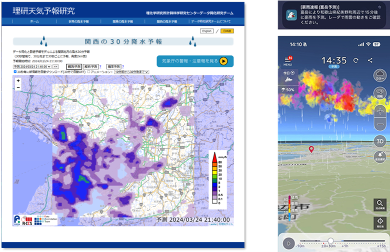 実証実験で得る予報データは、気象業務法に基づく予報業務許可の下、理研の天気予報研究のウェブページ(https://weather.riken.jp/)およびエムティーアイのスマートフォンアプリ「3D雨雲ウォッチ」で8月5日から8月31日まで公開します。