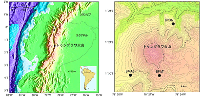 図1:トゥングラワ火山の位置(左)と観測点配置(右)