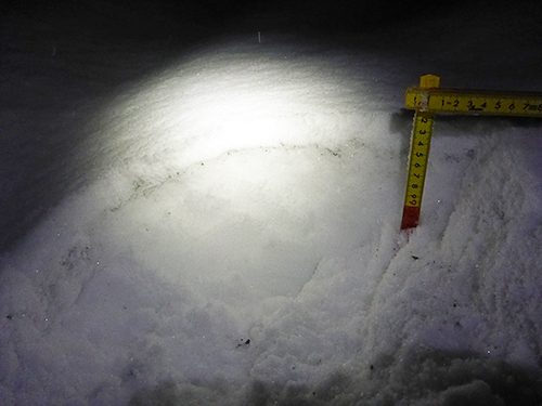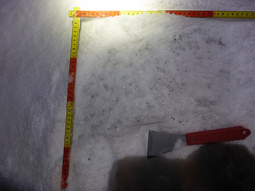 チャツボミゴケ公園前では添付写真のように積雪表面から1~3cm位下に厚さ1~2cm程度の灰色の火山灰に薄く染まった雪の部分が挟まっています。その中には粒径3~6mm大の砂サイズ以下の火山灰からなる凝集粒子(現場では凍って固い)が散在しています。