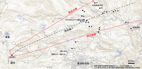 1月23日22時~24日まで草津白根山谷沢原火山観測施設前から熊倉・チャツボミゴケ公園、白根開善学校、焼尻温泉方面にかけて道路沿いで降灰調査を行った結果。++,+,±は、見た目で降灰多いから少ない順,-が降灰なしの部分。